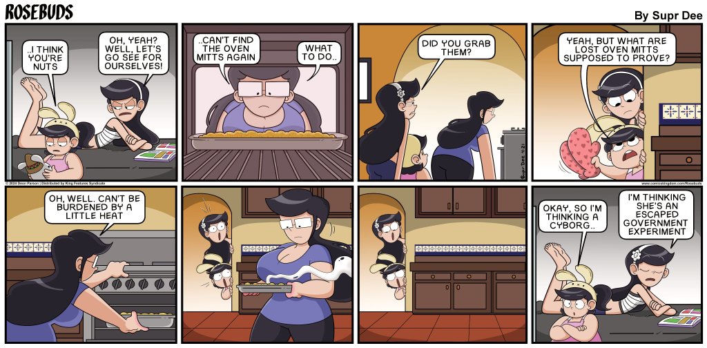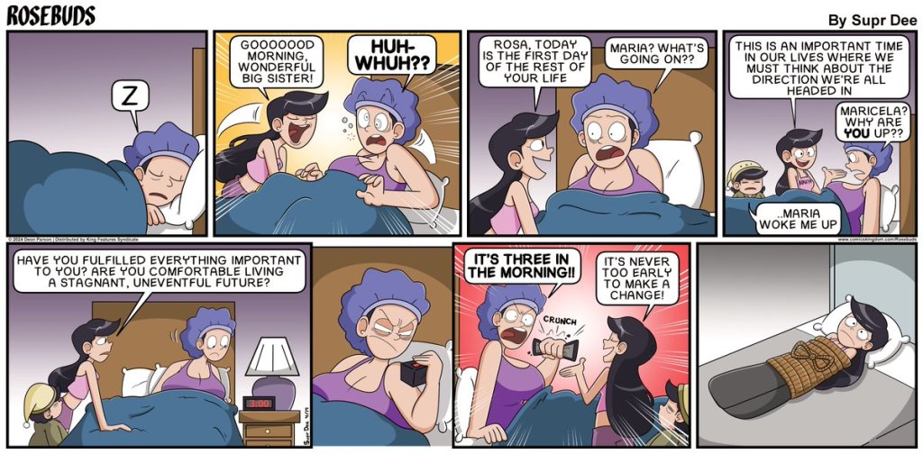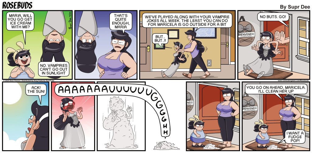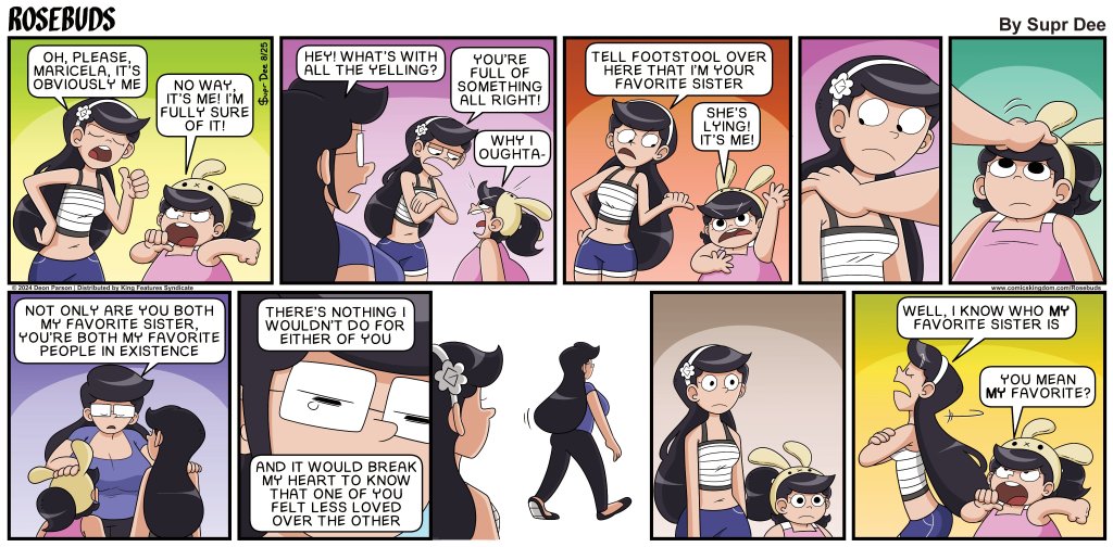 First published in 2020, Rosebuds is a syndicated comic strip about the bonds and rivalries between three sisters, Rosa, Maria, and Maricela Gonzalez, and the relationships formed between their antics.